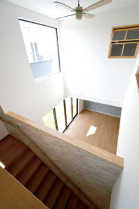 ・開放的な吹き抜け階段からは常にご家族様と顔を合わせられるようにリビングを一望できるようになっています。